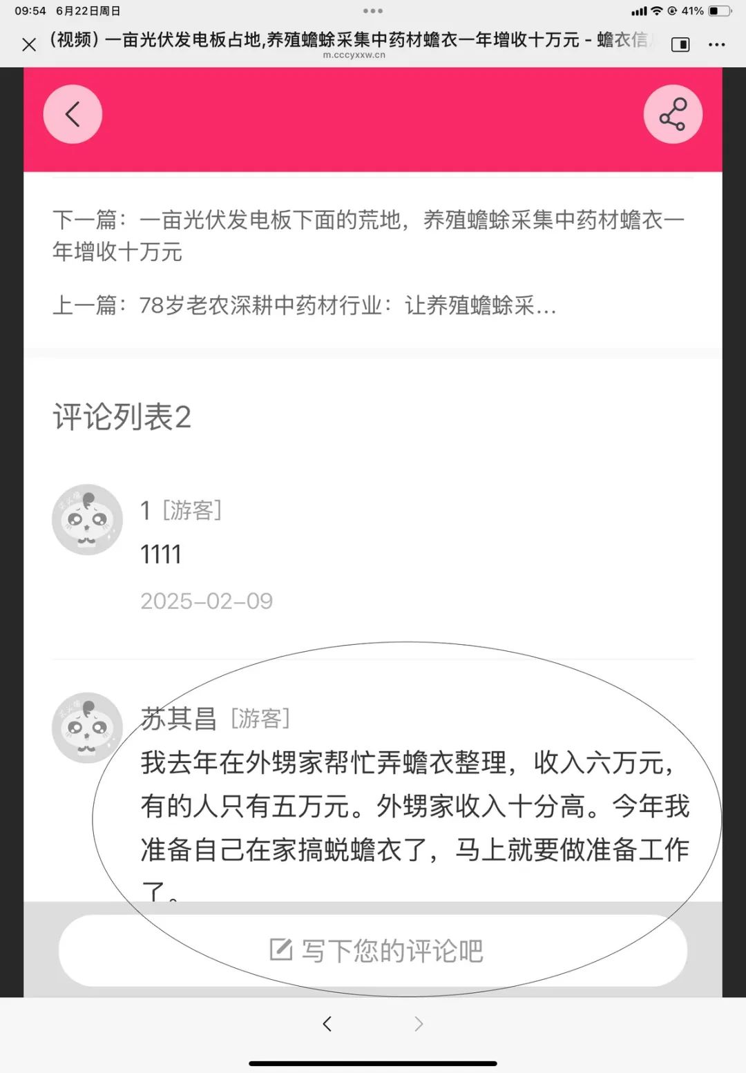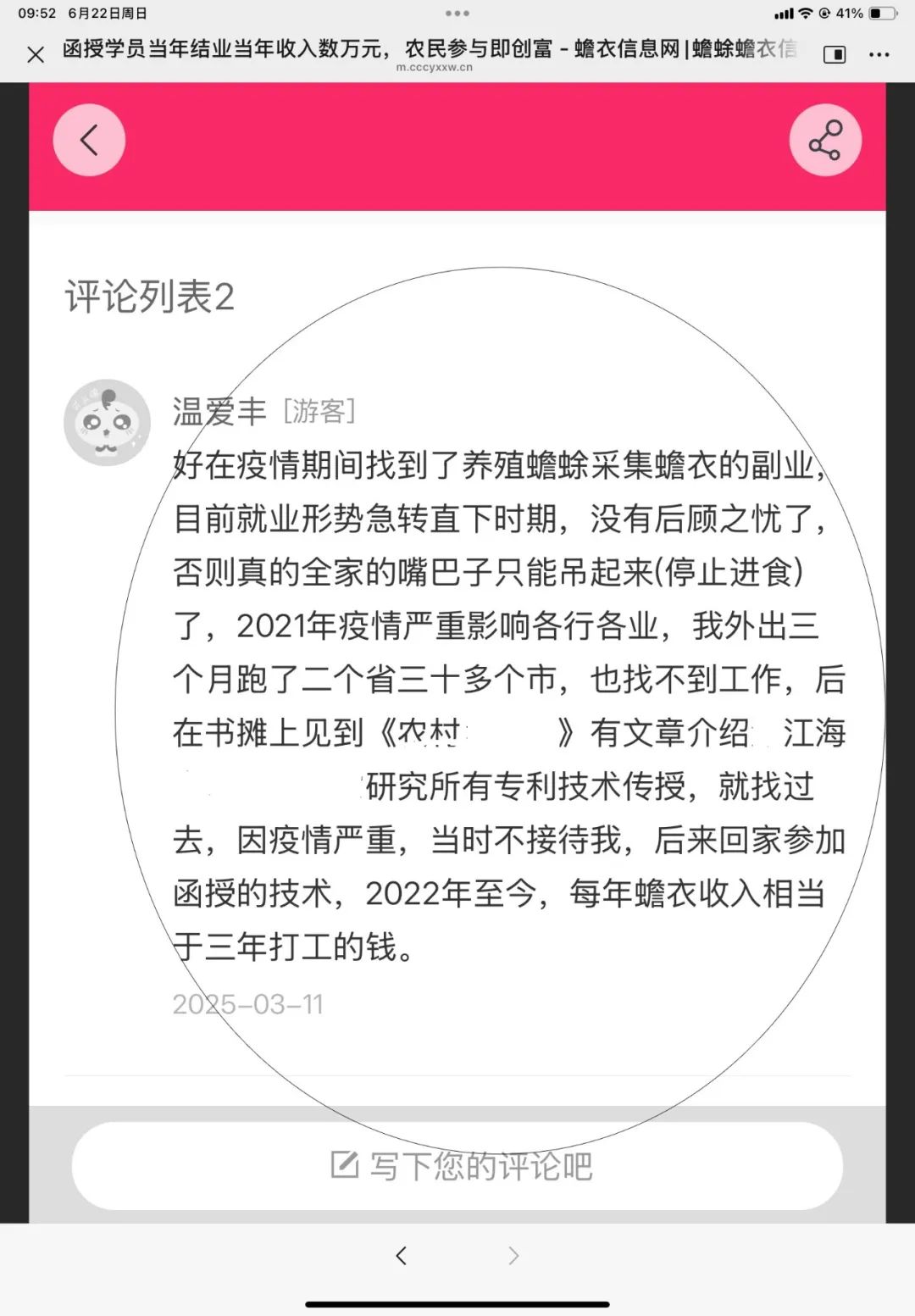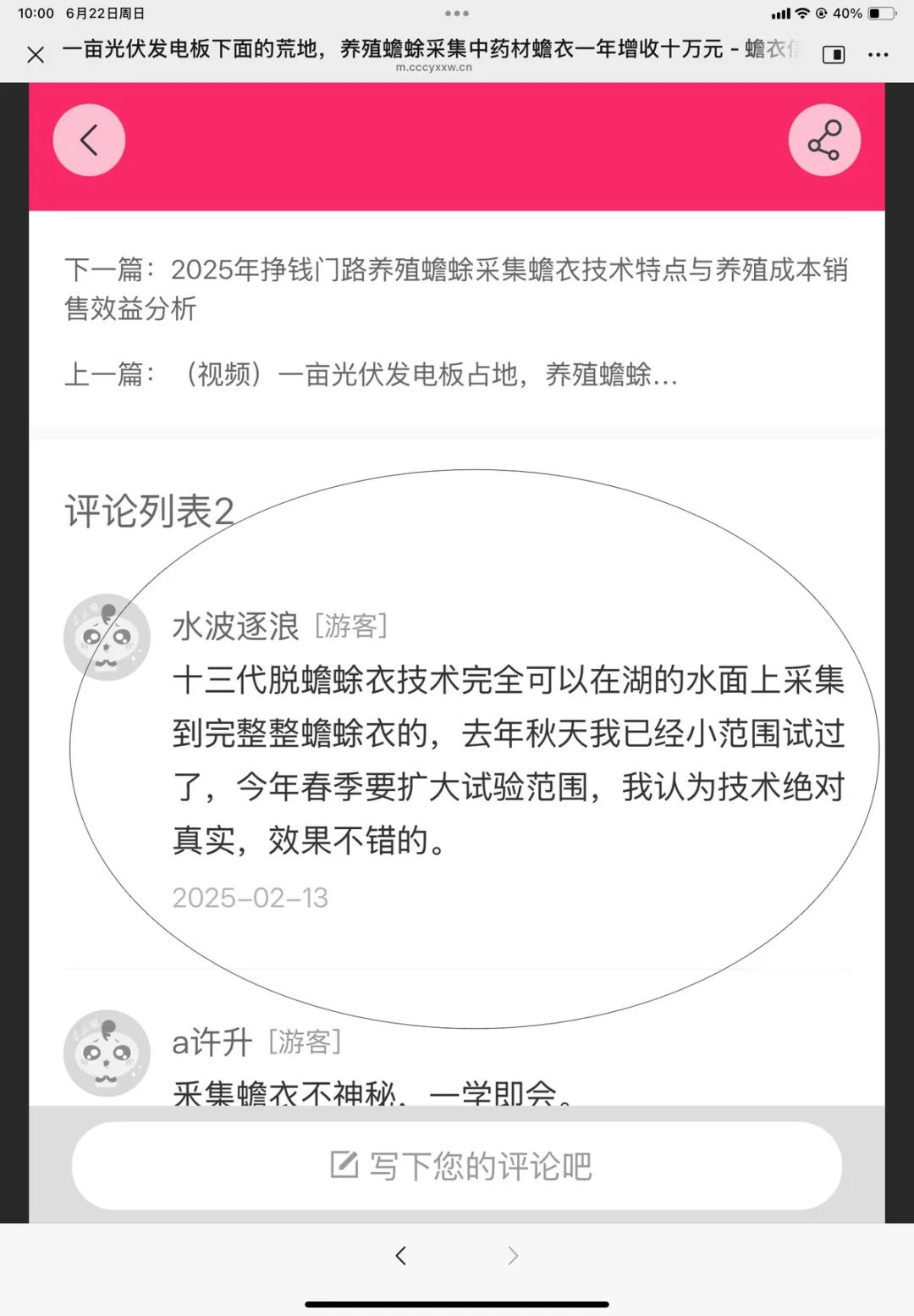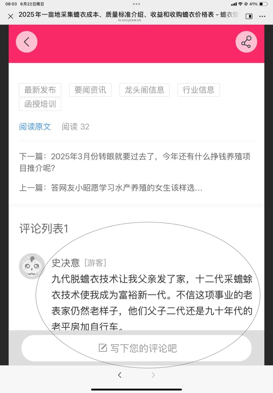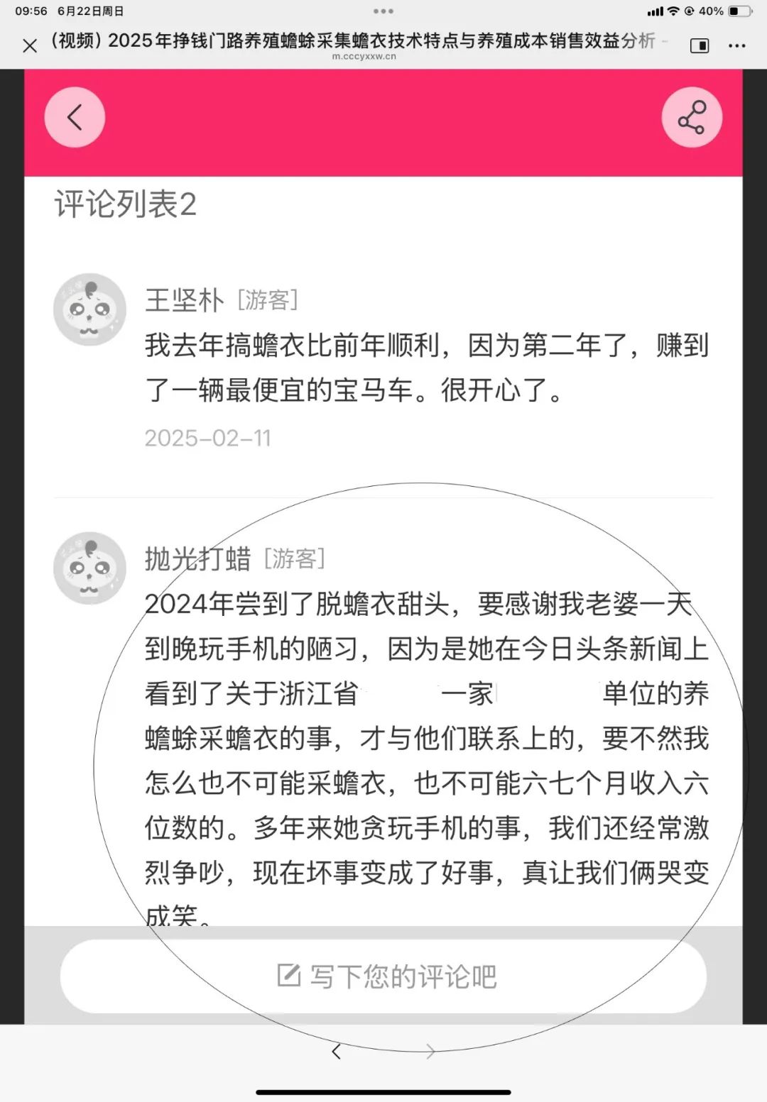 继十三项采集蟾衣知识产权之后,又一个养殖模式已成为养殖蟾蜍增加收入热点新话题:养殖模式一换,胜过一项新技术,他养一百只蟾蜍竟超过别人养一千只蟾蜍采集蟾衣挣钱?截止2025年6月末,今年销售和收购新蟾衣购销已经开始两个月了,有三个热点话题养殖户反响强烈:2025年高关税下,养殖模式、采集蟾衣技术,对蟾衣品质、蟾衣规格、蟾衣价格和养殖户增收有改天换地一般的影响。为此,感谢养殖户在此话题下贡献的留言,现选取部分留言截图以飨读者: