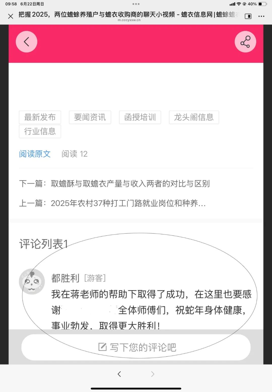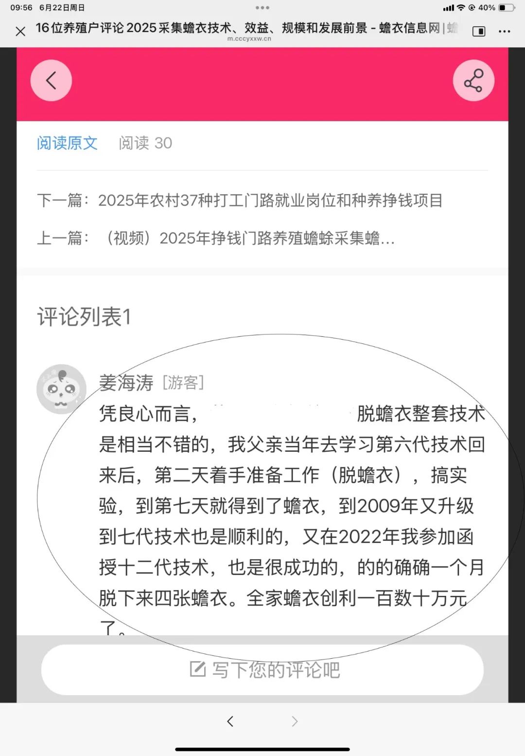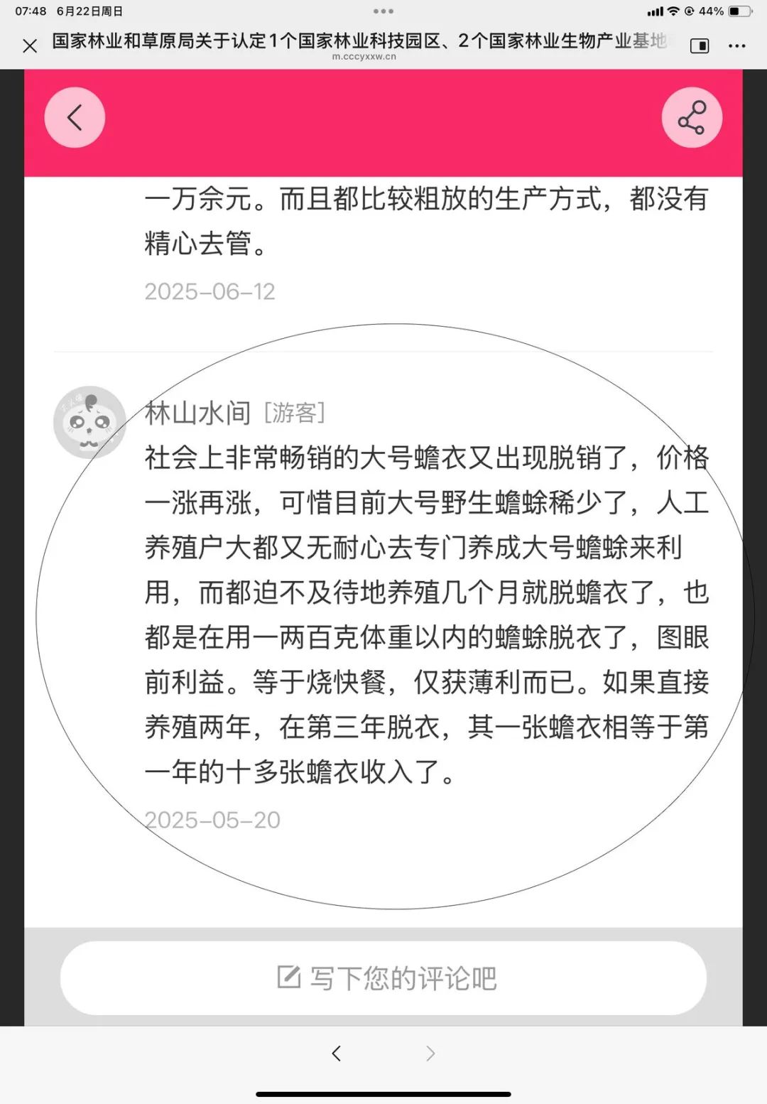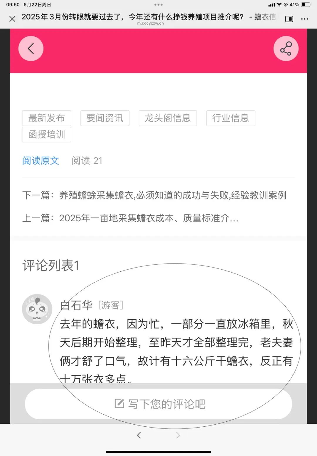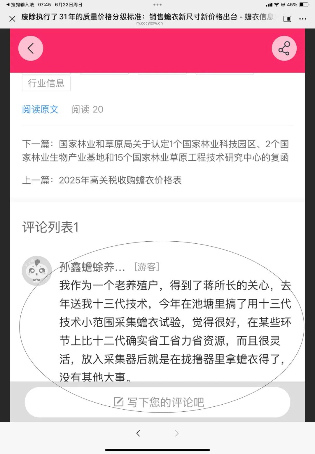 继十三项采集蟾衣知识产权之后,又一个养殖模式已成为养殖蟾蜍增加收入热点新话题:养殖模式一换,胜过一项新技术,他养一百只蟾蜍竟超过别人养一千只蟾蜍采集蟾衣挣钱?截止2025年6月末,今年销售和收购新蟾衣购销已经开始两个月了,有三个热点话题养殖户反响强烈:2025年高关税下,养殖模式、采集蟾衣技术,对蟾衣品质、蟾衣规格、蟾衣价格和养殖户增收有改天换地一般的影响。为此,感谢养殖户在此话题下贡献的留言,现选取部分留言截图以飨读者: