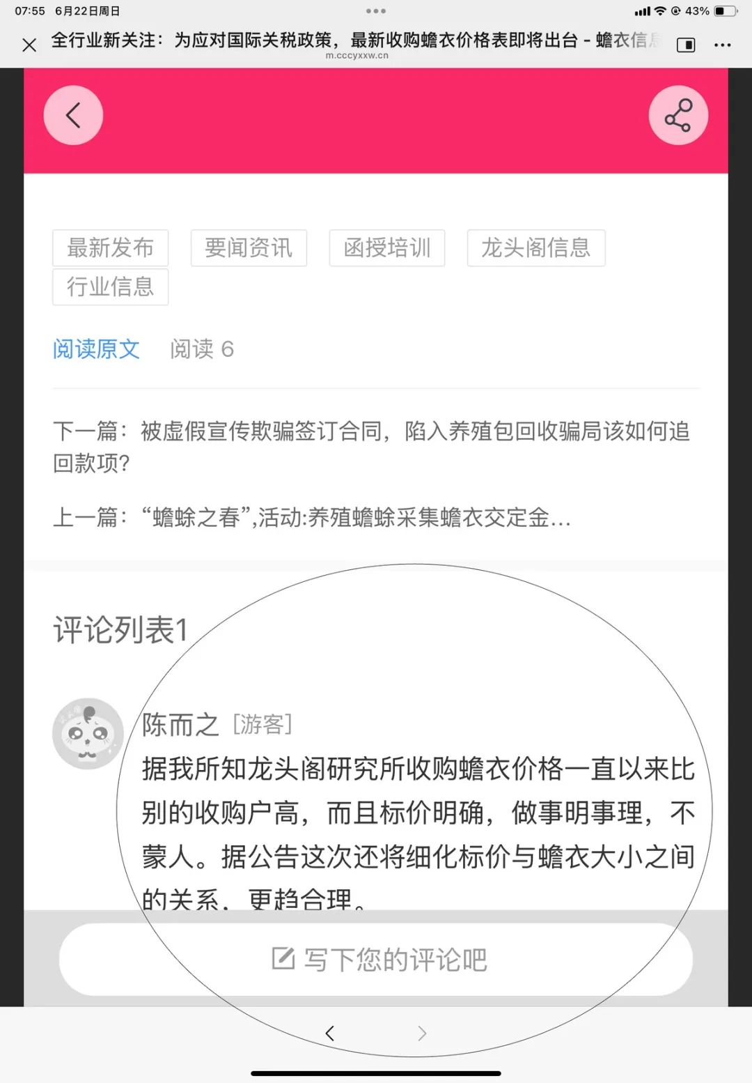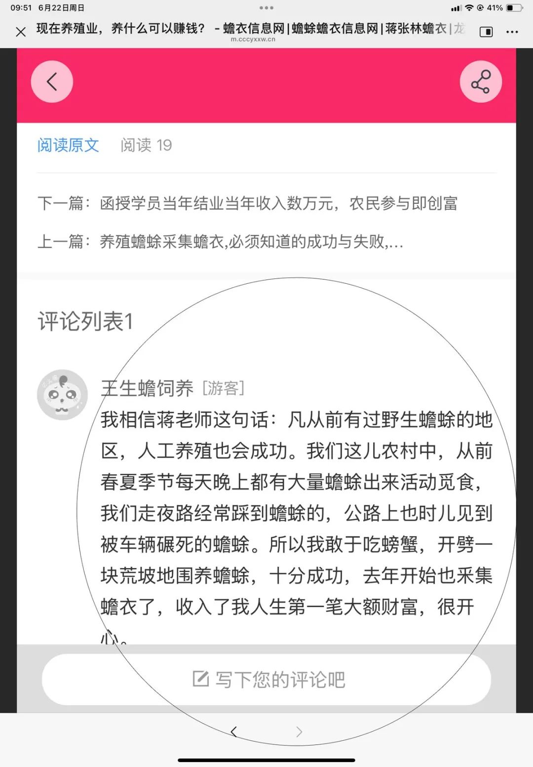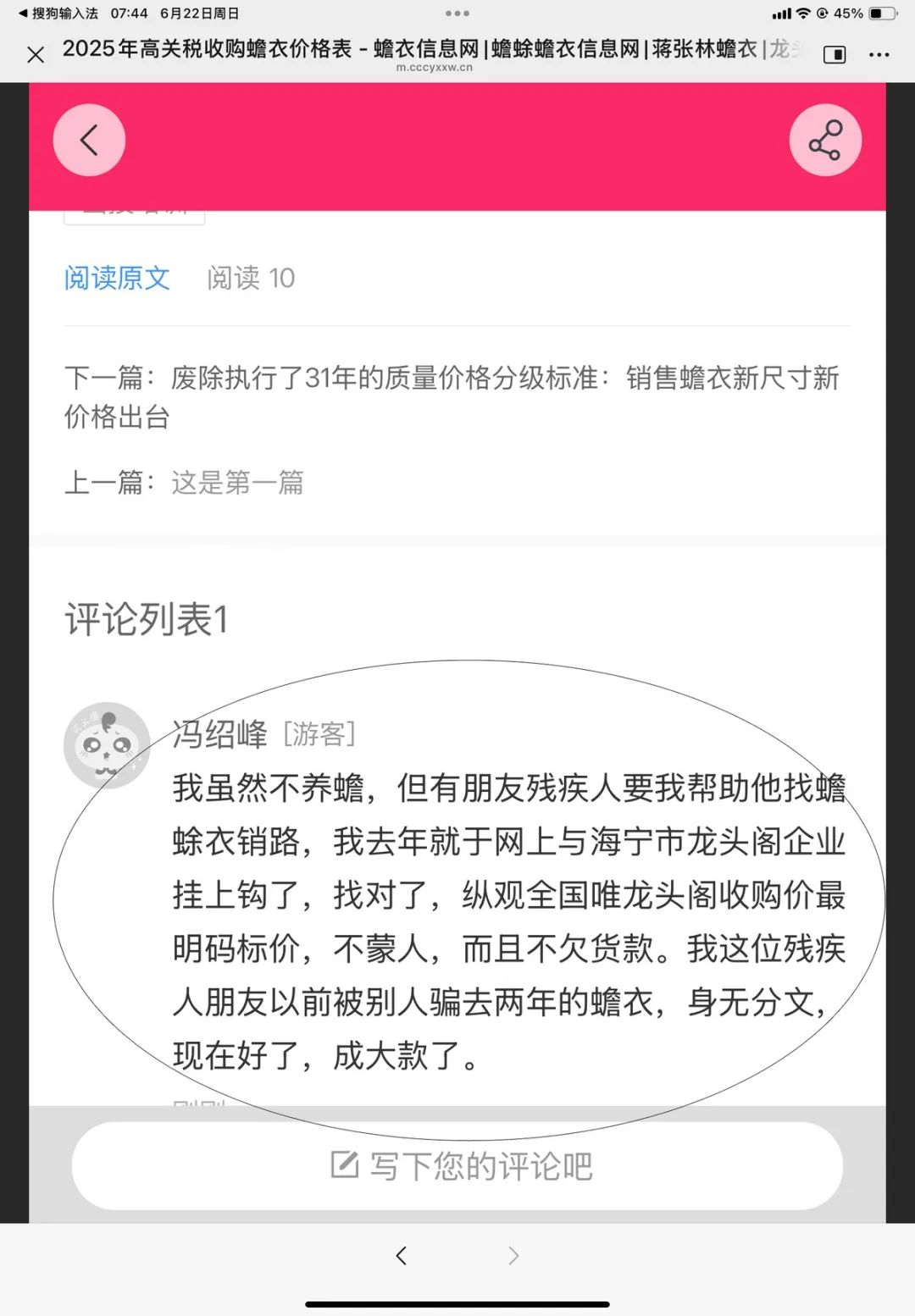 我虽然不养蟾,但有朋友残疾人要我帮助他找蟾蜍衣销路,我去年就于网上与海宁市龙头阁企业挂上钩了,找对了,纵观全国唯龙头阁收购价最明码标价,不蒙人,而且不欠货款。我这位残疾人朋友以前被别人骗去两年的蟾衣,身无分文现在好了,成大款了。