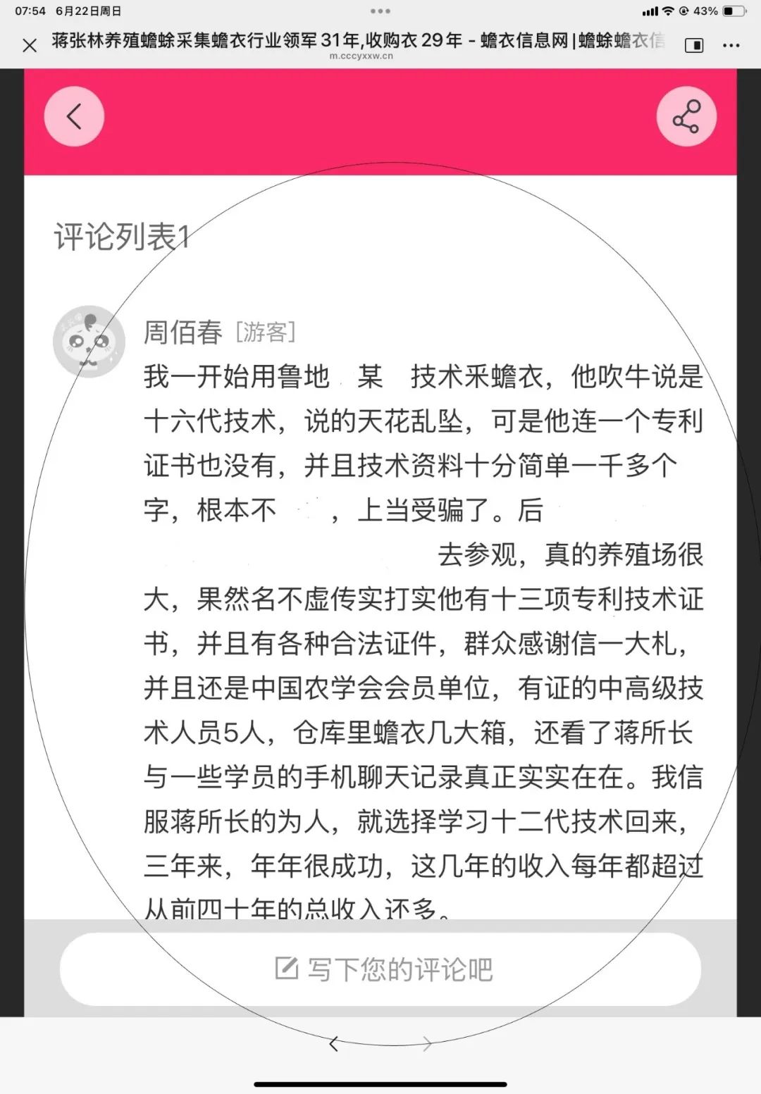 我一开始用鲁地一家技术采蟾衣,他吹牛说是十六代技术,说的天花乱坠,可是他连一个专利证书也没有,并且技术资料十分简单一千多个字,根本不正宗,上当受骗了。后了解到浙江龙头阁企业蒋张林事迹,前去参观,真的养殖场很大,果然名不虚传实打实他有十三项专利技术证书,并且有各种合法证件,群众感谢信一大札,并且还是中国农学会会员单位,有证的中高级技术人员5人,仓库里蟾衣几大箱,还看了蒋所长与一些学员的手机聊天记录真正实实在在。我信服蒋所长的为人,就选择学习十二代技术回来,三年来,年年很成功,这几年的收入每年都超过从前四十年的总收入还多。
