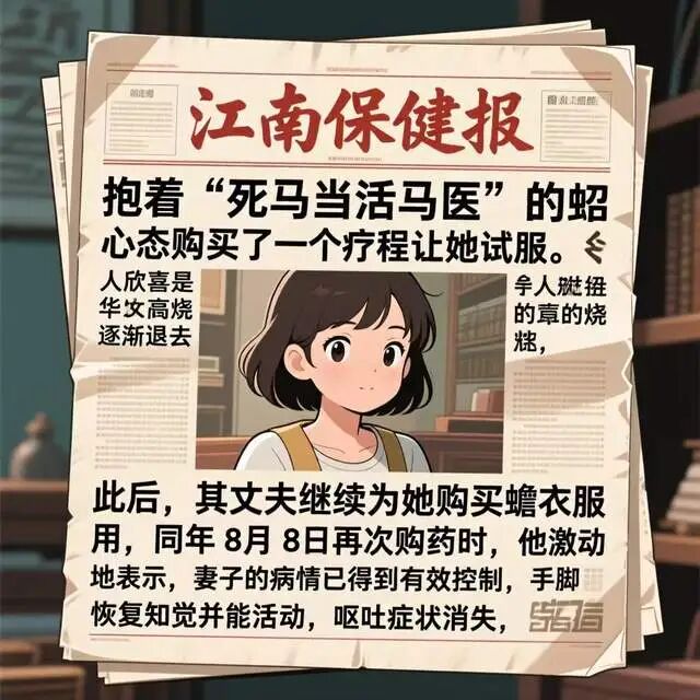 60岁的华女士确诊脑癌晚期后,在上海某医院治疗期间病情持续恶化,肿瘤压迫神经导致其无法说话、出现脑积水,最终不认识家人,生活完全不能自理,还频繁高烧、呕吐。2007年2月7日,其丈夫偶然在《江南保健报》上看到蟾衣的介绍,抱着“死马当活马医”的心态购买了一个疗程让她试服。令人欣喜的是,华女士的高烧逐渐退去,病情得到初步控制;后续持续服用后,手脚恢复知觉并能活动,呕吐症状消失,已停服医院开具的抗癌药三个月,身体一天天好转,连主治医生都对这一效果感到惊讶。