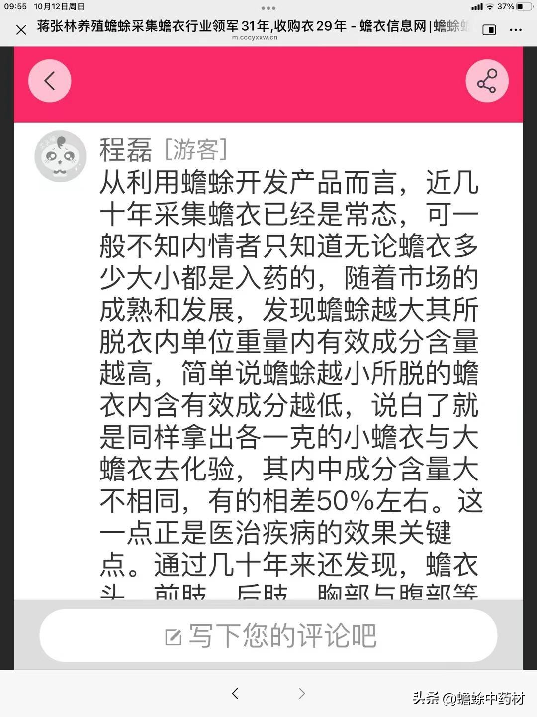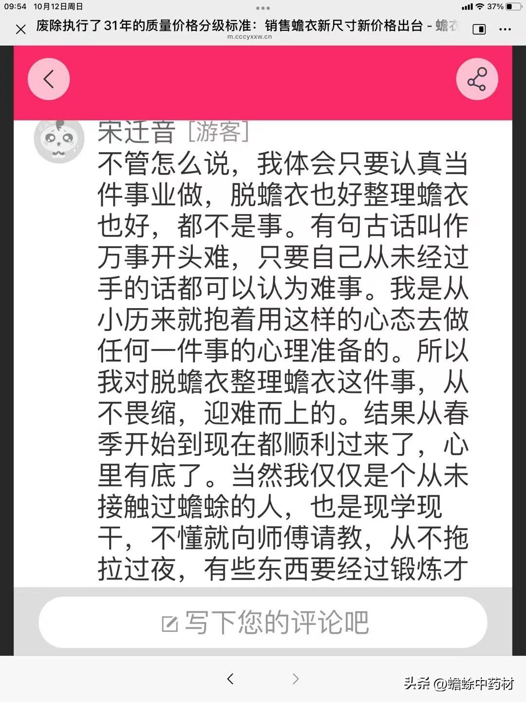宋迁音游客:不管怎么说,我体会只要认真当件事业做,脱蟾衣也好整理蟾衣也好,都不是事。有句古话叫作万事开头难,只要自己从未经过手的话都可以认为难事。我是从小历来就抱着用这样的心态去做任何一件事的心理准备的。所以我对脱蟾衣整理蟾衣这件事,从不畏缩,迎难而上的。结果从春季开始到现在都顺利过来了,心里有底了。当然我仅仅是个从未接触过蟾蜍的人,也是现学现干,不懂就向师傅请教,从不拖拉过夜,有些东西要经过锻炼才