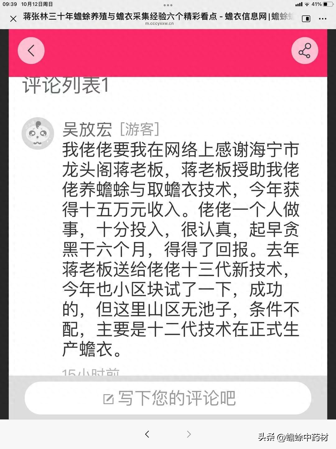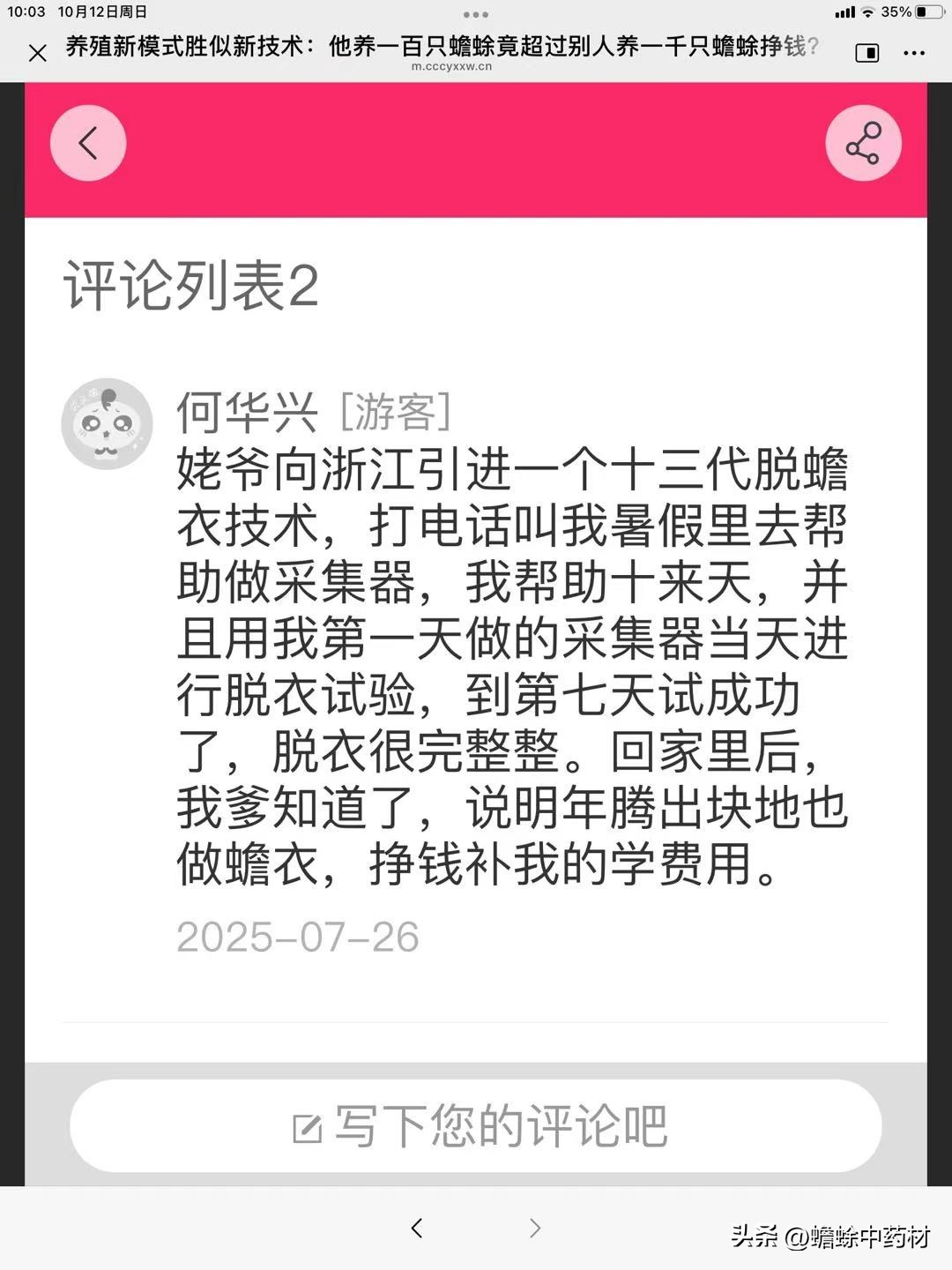 何华兴[游客]姥爷向浙江引进一个十三代脱蟾衣技术,打电话叫我暑假里去帮助做采集器,我帮助十来天,并且用我第一天做的采集器当天进行脱衣试验,到第七天试成功了,脱衣很完整整。回家里后我爹知道了,说明年腾出块地也做蟾衣,挣钱补我的学费用。