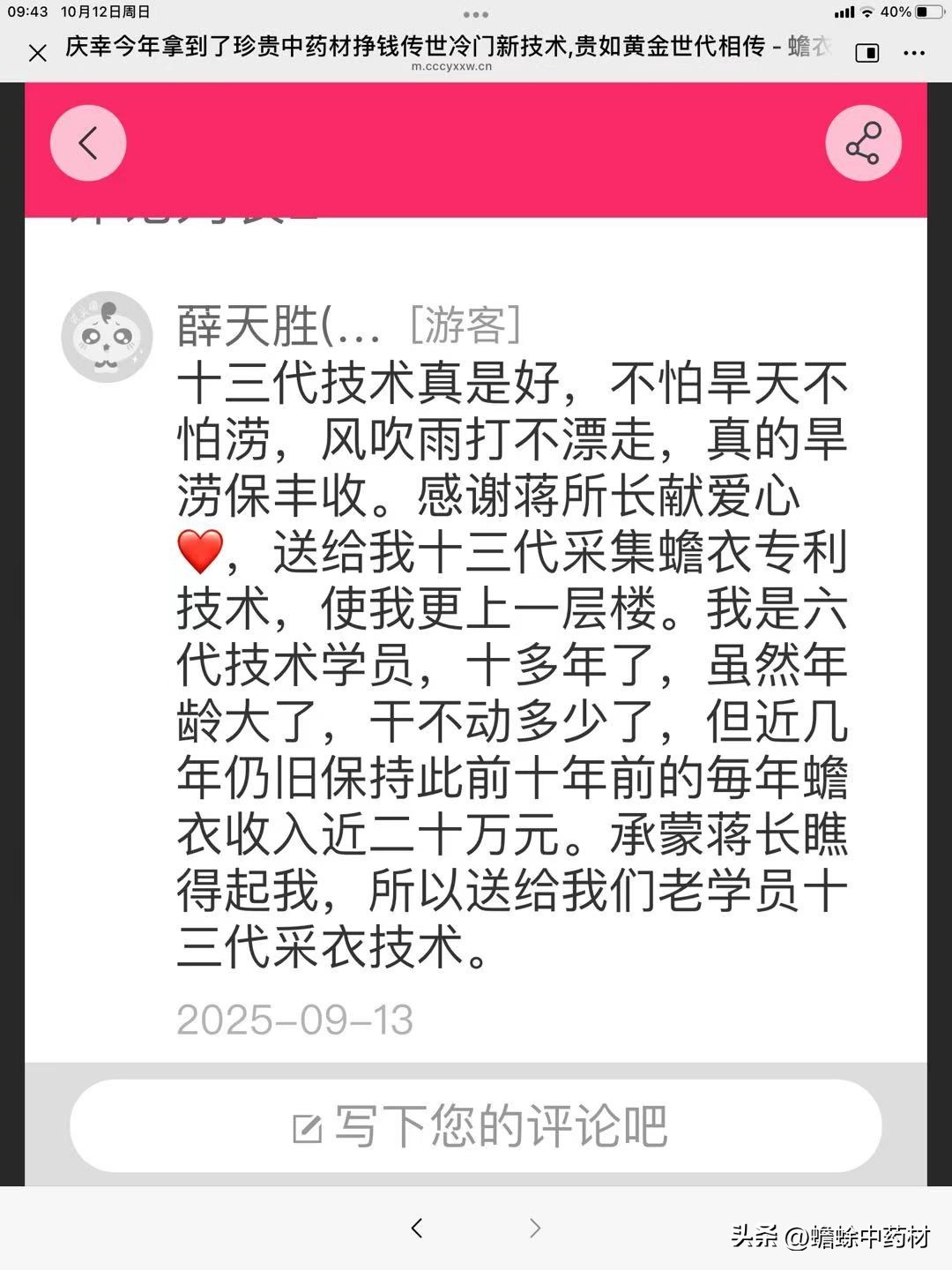 薛天胜(...[游客]十三代技术真是好,不怕早天不怕涝,风吹雨打不漂走,真的早涝保丰收。感谢蒋所长献爱心,送给我十三代采集蟾衣专利技术,使我更上一层楼。我是六代技术学员,十多年了,虽然年龄大了,干不动多少了,但近几年仍旧保持此前十年前的每年蟾衣收入近二十万元。承蒙蒋长瞧得起我,所以送给我们老学员十三代采衣技术。