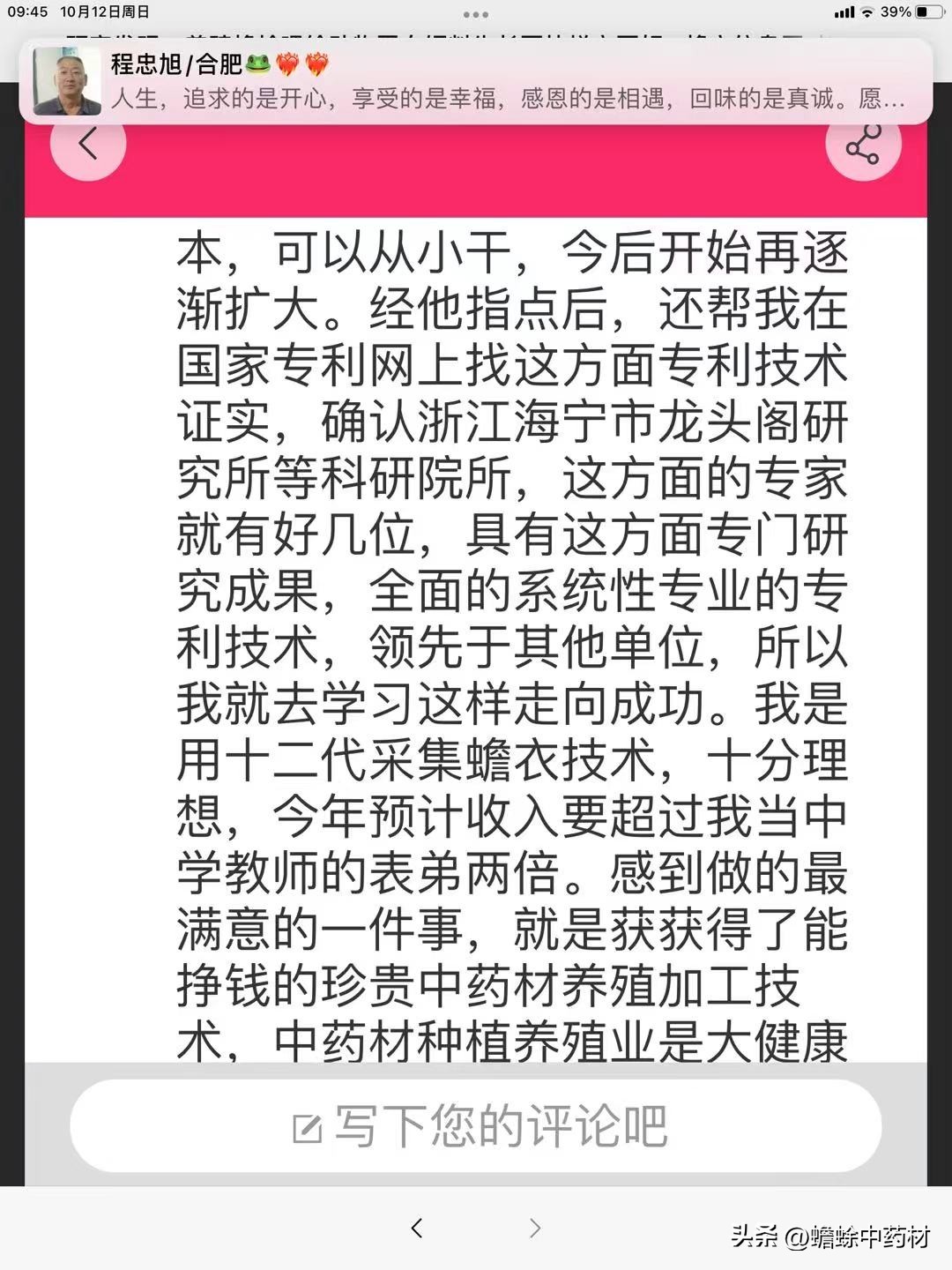 国家专利网上找这方面专利技术证实,确认浙江海宁市龙头阁研究所等科研院所,这方面的专家就有好几位,具有这方面专门研究成果,全面的系统性专业的专利技术,领先于其他单位,所以我就去学习这样走向成功。我是用十二代采集蟾衣技术,十分理想,今年预计收入要超过我当中学教师的表弟两倍。感到做的最满意的一件事,就是获获得了能挣钱的珍贵中药材养殖加工技术,中药材种植养殖业是大健康