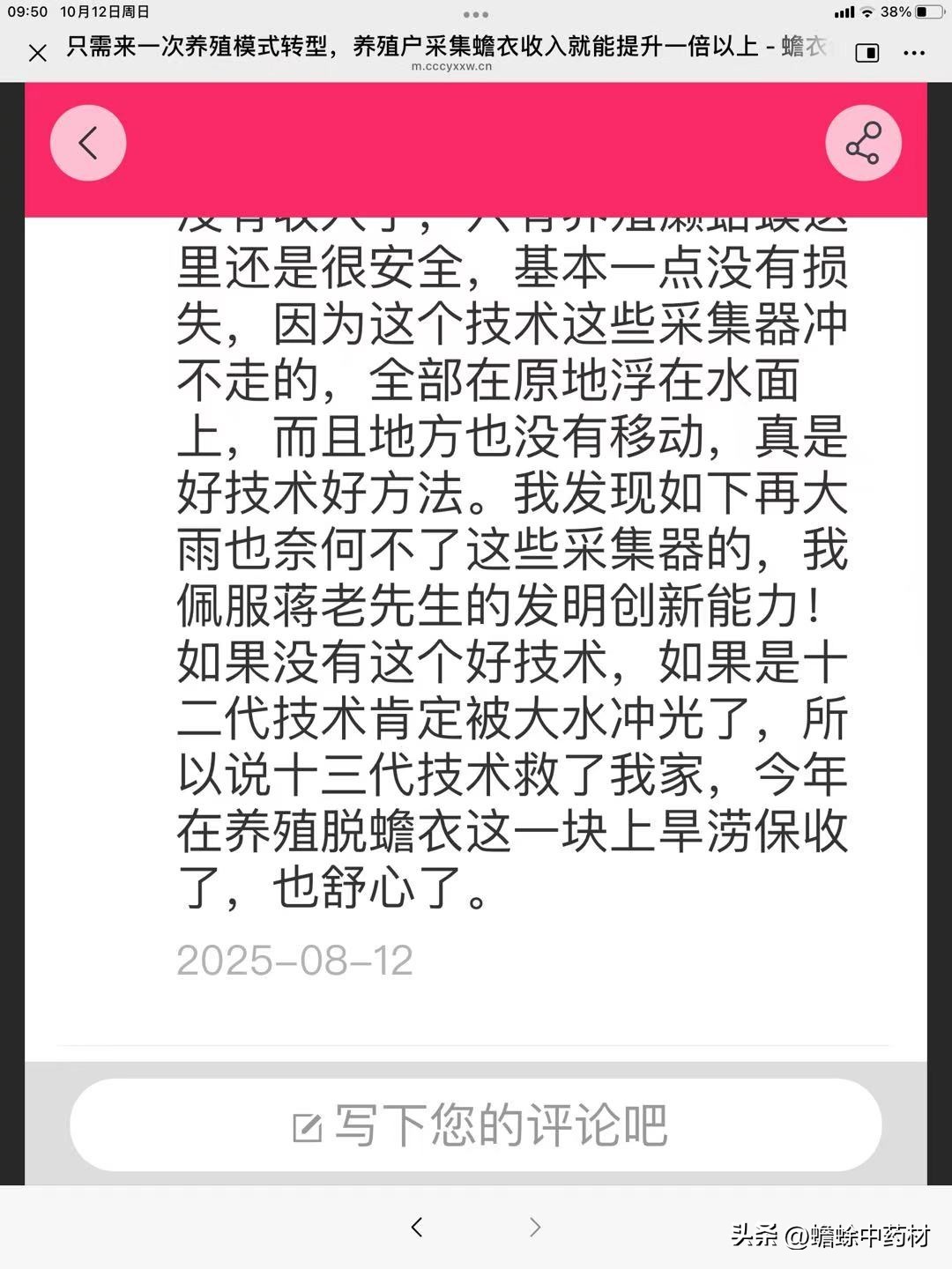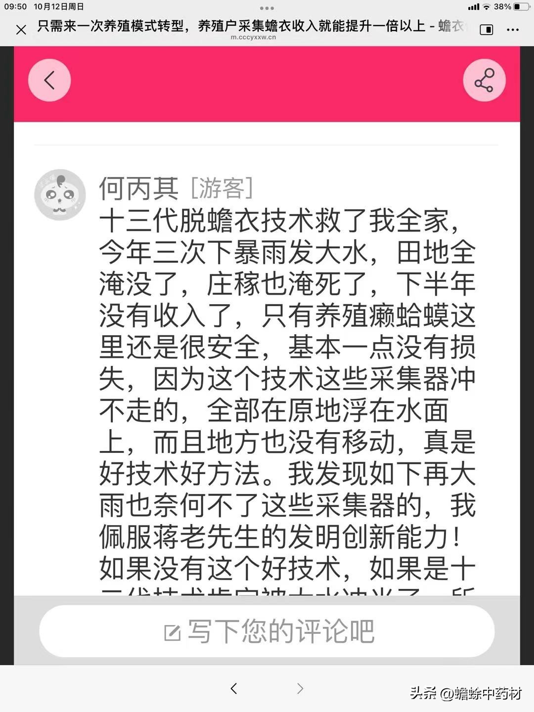 何丙其[游客]十三代脱蟾衣技术救了我全家今年三次下暴雨发大水,田地全淹没了,庄稼也淹死了,下半年没有收入了,只有养殖癞蛤蟆这里还是很安全,基本一点没有损失,因为这个技术这些采集器冲不走的,全部在原地浮在水面上,而且地方也没有移动,真是好技术好方法。我发现如下再大雨也奈何不了这些采集器的,我佩服蒋老先生的发明创新能力!如果是十