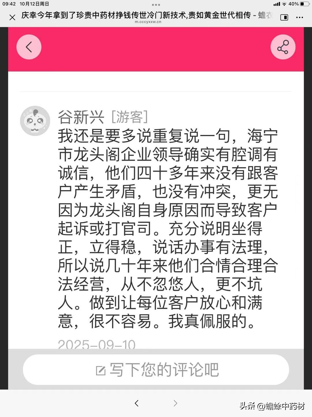 谷新兴[游客]我还是要多说重复说一句,海宁市龙头阁企业领导确实有腔调有诚信,他们四十多年来没有跟客户产生矛盾,也没有冲突,更无因为龙头阁自身原因而导致客户起诉或打官司。充分说明坐得正,立得稳,说话办事有法理所以说几十年来他们合情合理合法经营,从不忽悠人,更不坑人。做到让每位客户放心和满意,很不容易。我真佩服的。